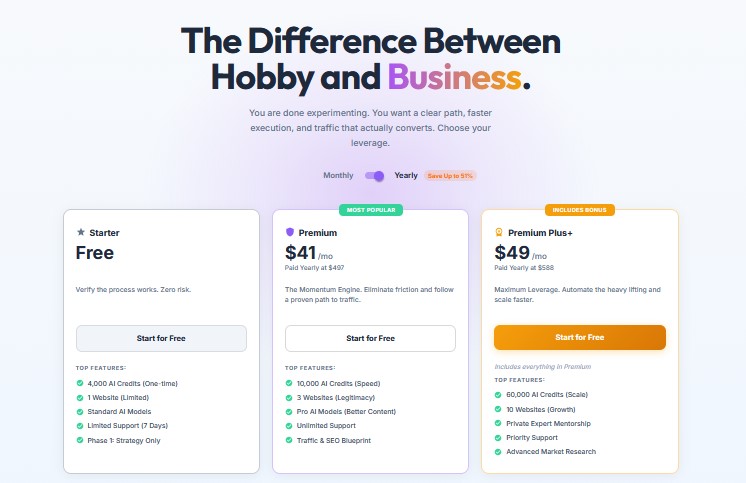 Rather than forcing you to juggle separate subscriptions for websites, keyword research, and training, the platform centralizes everything. It guides users through a four-step process: choosing a niche, building a website, creating content, and monetizing that traffic through affiliate links.