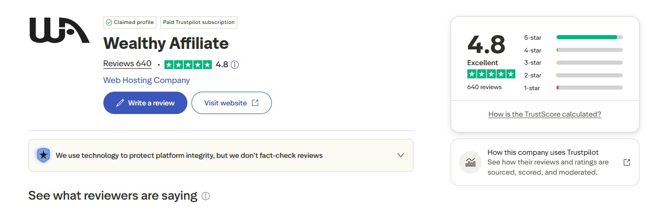 • Is Wealthy Affiliate a scam? No, it is a legitimate educational platform and hosting provider for building online businesses. It has a 4.8 Trustpilot score – higher than many other similar businesses.